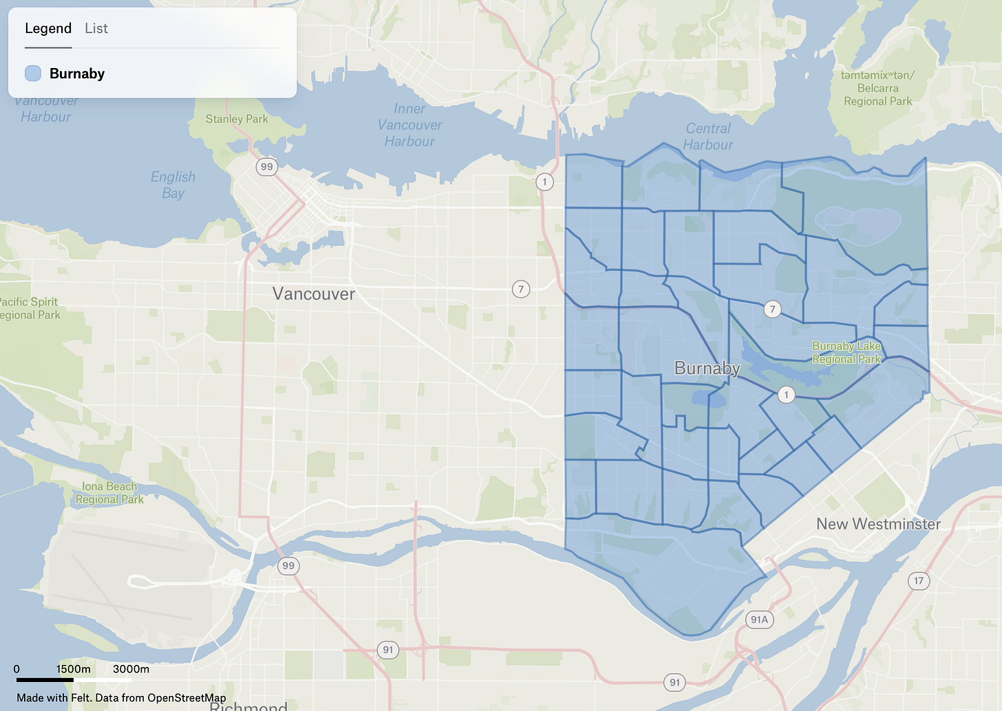 After that trek, I was bummed to see no notifications or stats about my coverage in the city. It was clear: time to add support for Burnaby. But to do that, I needed data on the borders of Burnaby’s neighbourhoods.