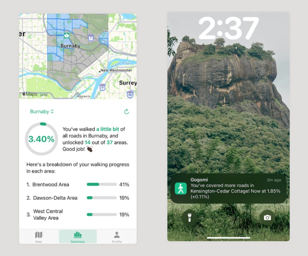With my DIY Burnaby map ready, it was time to feed it to Gogomi. The first step was exporting to GeoJSON and then running that through an ingestion pipeline (fancy for a bunch of functions I stitched together, hehe). The functions in the pipeline take the boundaries, extract road networks, store them in Gogomi’s database, and recalculate all coverages using the walks it has tracked so far.